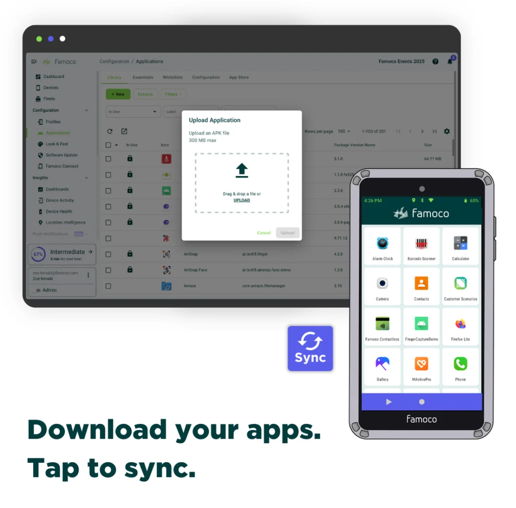 Power on your devices to instantly connect to the Famoco Management Suite. Deploy your devices instantly without manual intervention, upload your business apps to the private app store and get ready for fleet-wide configuration.